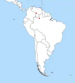Nannostomus anduzei is restricted to the Amazonian region of the South American continent and has only been formally reported from two localities in the north of that area. The first, and site of discovery, was 20 km (12 mi) north of the small Venezuelan town of Puerto Ayacucho in a small lagoon, in the upper regions of the Rio Orinoco, at 5° 50' N, 67° 30' W. The second site was some 700 km (430 mi) to the southeast, in the Lago Caatinga, off the Rio Ererê, a tributary of the Rio Negro at 0° 14' S; 63° 53' W. These limited data are reflected in the range map above, where it is not possible to say where else the species might be found. However, because these fish occasionally do appear in the aquarium trade (see also below), their true range likely is somewhat wider than indicated. While the two known sites are geographically widely separated in two river systems, the Orinoco and the Negro are linked by the Casiquiare canal, so migration between the two sites is possible. N. anduzei does not appear in a systematic list of fishes of Columbia,[8] though the northern Orinoco locality is only a few kilometres from the Colombian border. This could represent undersampling in what is a remote part of the forest.
