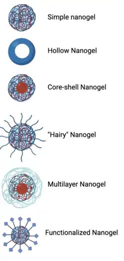 - ^ a b c d e f g h i j Li, Cuixia; Obireddy, Sreekanth Reddy; Lai, Wing-Fu (2021-01-01). "Preparation and use of nanogels as carriers of drugs". Drug Delivery. 28 (1): 1594–1602. doi:10.1080/10717544.2021.1955042. ISSN 1071-7544. PMC 8317930. PMID 34308729.