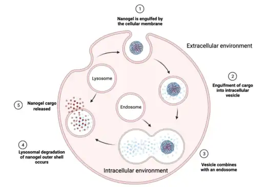 After nanogels exit the vasculature, they diffuse through the interstitial space into their target tissue.[7] At the cellular level, nanogels can be internalized by a large number of different types of endocytosis that depend on the particle’s size, shape, and surface properties.[3][7] Endocytosis is the most common mechanism that starts with the nanogels engulfed by the cellular membrane.[3][7] The nanogels are transported in intracellular vesicles for delivery to endosomes that eventually combine with lysosomes.[3][7] Once lysosomes are released into the cytosol of a cell, they deliver their cargo immediately or move to the appropriate cellular compartment.[3][7]