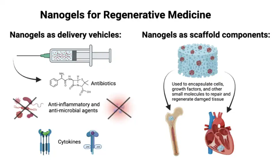 To repair and regenerate damaged tissue, nanogels have been explored to not only encapsulate drugs and growth factors for local administration, but also to serve as porous scaffolds at a tissue implantation site.[44] Boron-containing temperature-responsive nanogels formed a solid scaffold upon injection into a critical bone defect and continued to induce the production of new osteoblast cells.[49] To treat the effects of myocardial infarction, one in vivo study loaded temperature-responsive nanogels with cardiac stem cells and observed improved cardiac function through an increase in left ventricular ejection.[50] Blood vessels have been successfully regenerated in an in vivo model of ischemia using nanogels to encapsulate vascular endothelial growth factors.[51] Heparin-based nanogels loaded with growth factors have also been tested in the regeneration of the urethral muscle that causes urinary incontinence.[52]