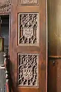 These four high-quality carved oak panels have been dated, and while the trees were felled soon after 1423, their carving style suggests a later date of 15-16th century. Despite the fleur de lys motifs on the shields in the panels, the timber is likely of Welsh origin (most probably from nearby Coed Marchan wood), and unlikely to be continental. The carvings most likely honoured Arthur (1486–1502), eldest son of Henry VII.[14][15]