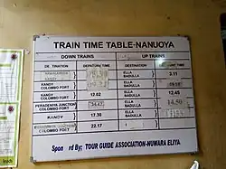 The Nanu Oya railway station is the 63rd station on the Main Line, and is 206.9 km (128.6 mi) away from Colombo. All trains including Podi Menike and Udarata Menike express trains service the station. The station was a junction and branching point for the Udupussallawa narrow gauge railway line connecting Nanu Oya with Ragala via Nuwara Eliya.