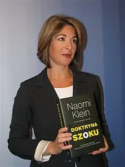 Klein signed a 2004 petition titled "We would vote for Hugo Chávez".[58][59] In 2007, she described Venezuela under the Chávez government as a country where "citizens had renewed their faith in the power of democracy to improve their lives", and described Venezuela as a place sheltered by Chávez's policies from the economic shocks produced by capitalism.[60] Rather, according to Klein, Chávez protected his country from financial crisis by building "a zone of relative economic calm and predictability."[60][61] According to reviewer Todd Gitlin, who described the overall argument of Klein's book The Shock Doctrine (2007) as "more right than wrong," Klein is "a romantic," who expected that the Chávez government would produce a bright future in which worker-controlled co-operatives would run the economy.[62] The Shock Doctrine was consistent with her prior thinking about globalization, and in that book she describes Chávez' policies as an example of public control of some sectors of the economy as protecting poor people from harm caused by globalization.[63] In 2017, Mark Milke and conservative writer James Kirchick criticized Klein for her support of Chávez.[59][64]