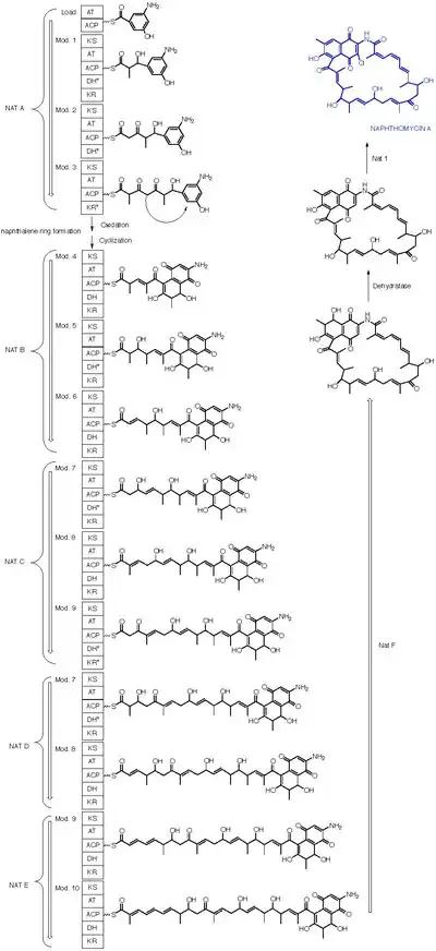 Naphthomycin A is a type of naphthomycin. It was isolated as a yellow pigment from Streptomyces collinus and it shows antibacterial, antifungal, and antitumor activities.[1] Naphthomycins have the longest ansa aliphatic carbon chain of the ansamycin family.[2] Biosynthetic origins of the carbon skeleton from PKS1 were investigated by feeding 13C-labeled precursors and subsequent 13C-NMR product analysis. Naphthomycin gene clusters have been cloned and sequenced to confirm involvement in biosynthesis via deletion of a 7.2kb region.[3] Thirty-two genes were identified in the 106kb cluster.[4]