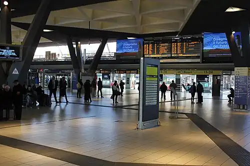 Napoli Centrale (Naples Central Station) (Italian: Stazione di Napoli Centrale) (IATA: INP) is the main railway station in the city of Naples and in southern Italy and the sixth largest station in Italy in terms of passenger flow with an annual ridership of 50 million.[1] It is located next to Piazza Garibaldi to the east of the old city. It is the primary rail terminus and station for Naples, and serves Trenitalia national railways and EAV. This one has an underground section known as Stazione di Napoli Piazza Garibaldi (Naples Garibaldi Piazza station), which is served by the metropolitan trains of the line 2, line 1 (Garibaldi), and 3, 12, 14, and 15 EAV Circumvesuviana lines which is accessible from 2 entrances inside the Centrale station, 1 outside in glass, and from the new Garibaldi Square.