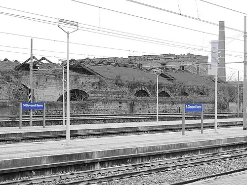 Opened at the end of the 19th century, the new station was activated on 28 November 1909 to replace the old one.[1] In the early 2000s it underwent substantial modernization works, completed in 2010. The new platforms were relocated about a hundred meters (in the direction of Naples) from the original ones, on the site of the old goods yard, abandoned at the end of the 1990s. The entrance to the station, which always takes place from Piazza San Giovanni Battista, where the old station building is located, leads to a large parking lot and to the sidewalks.[2] Next to the station is the tram depot, as well as the terminus stop, of San Giovanni a Teduccio. The car park has never actually been open to the public, despite being a useful train-car interchange to reach the center and the western suburbs of the city.