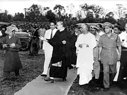 In March 1959, Das, along with five of his colleagues and a sectional commander, were directed to get to the international border to escort Tenzin Gyatso, the 14th Dalai Lama in order to welcome him in India. The monk, then 24, at the onset of the 1959 Tibetan uprising had fled Tibet and undertaken a 13-day trek disguised as a soldier to escape Chinese armed forces.[1] Das and his unit started from Lumla where he was posted as a rifleman with the ninth platoon of the Assam Rifles to move towards Shakti, a point along the India-Tibet border. He would later recount that the unit was woken at 3 am and asked to pack their lunch and go to Shakti.[2] The unit reached Shakti with .303 British Enfield rifles to escort the Dalai Lama and 20 of his guards on yaks and horseback.[2] Guards from the ninth platoon of the Assam Rifles had earlier brought the Dalai Lama from Zuthangbo to Shakti.[3][4] The Dalai Lama was granted a reception in Lumla before being escorted further to Tawang in Arunachal Pradesh.[2][5] He received a guard of honour from the Assam Rifles in Tawang before going to Bomdila.[3]