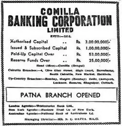 - ^ Sengupta, Subodh Chandra; Basu, Anjali, eds. (2002) [First published 1976]. নরেন্দ্রচন্দ্র দত্ত [Narendra Chandra Dutta]. Saṃsada bāṅāli caritābhidhāna সংসদ বাঙালি চরিতাভিধান [Parliament Bengali Biographical Dictionary] (in Bengali). Vol. 1 (4th ed.). Kolkata: Sahitya Samsad. pp. 247–248. ISBN 81-85626-65-0. নরেন্দ্রচন্দ্র দত্ত (২৫-১১-১৮৭৮ .১৫-৪-১৯৬২) ... কুমিল্লা ব্যাঙ্কিং কর্পোরেশনের পত্তন করেন। ... তখন তিনি অন্য ব্যাঙ্কের সঙ্গে মিশে ইউনাইটেড ব্যাঙ্ক গঠনের সিদ্ধান্ত গ্রহণ করেন। [Narendra Chandra Dutta (25-11-1878 .15-4-1962) ... founded the Comilla Banking Corporation. ... then he decided to merge with other banks and form the United Bank.]