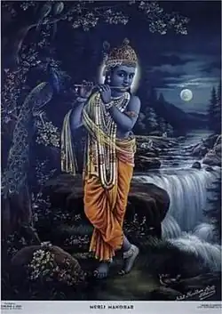 Narottam Narayan's paintings marked a conscious return to a more traditional style of representation, wherein realism was less paramount than the images' iconic nature and engagement with the viewers. An "example par excellence" is his painting Murli Manohar (1934), which is reputed to be the best-selling image in the history of the industry.[2] Other famous paintings of his, mass-produced by S. S. Brijbasi, include Shree Satyanarain (of Satyanarayana),[6] Kailash Pati Shankar (of Shiva),[7] depictions of Maharana Pratap and Shivaji, and images having to do with the independence struggle including portraits of Gandhi and Nehru, Mata ka Bandhan Mochan, and, painted after Gandhi's death, Gandhiji ki swargyatra (Gandhi's ascent to heaven).[3]