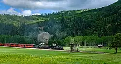 Tourism increased along the Silverton branch following World War II, and the area was popularized through Western films which frequently filmed along the San Juan Extension and the railroad became a popular road trip destination.[12] Unable to abandon the Silverton branch, the D&RGW operated it as an isolated narrow gauge and steam powered route until 1981 when the line was sold and rebranded as the Durango and Silverton Narrow Gauge Railroad.