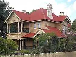 The front elevation is dominated by a double-storeyed gabled verandah on the left which has cast-iron balusters and frieze and a pierced timber valance. On the right is a gabled portico. This leads onto a small verandah, enclosed by timber louvres, which projects to the side.[1]