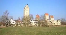 Despite the demolitions and losses, the former water castle is still one of the most important and impressive castle systems in Bavaria. In addition to the partially preserved enceinte, three wall towers and the high bergfried have survived. The four towers are capped by steeply pitched gable roofs. The gable walls are made of brick. The bergfried and East Tower have stepped gables.