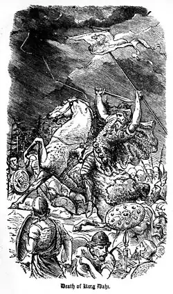 An early list of Nath Í's battles takes him outside Ireland, including battles in Strathclyde and Kincardine in Scotland, and an expedition across the English Channel to the Alps.[6]: pp. 212–213 In the Annals of Ulster there is an entry for the year 445 which originally consisted solely of Nath Í's name. Later writers, presuming this to be his death notice, added the detail that he was struck by lightning in the Alps,[1] circumstances also recounted in the Lebor Gabála,[3] Keating[5] and the Annals of the Four Masters, the latter of which dates it to 428.[4] According to legend, his followers carried his body back to Ireland, winning ten battles on the way, and buried him at Cruachan, capital of Connacht.[6]: 212–213 [2]: pp. 77–78 [3][5] A standing stone said to mark his grave is part of the Rathcroghan complex of archeological sites near Tulsk in County Roscommon.[8]