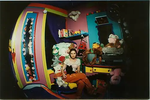 In 1997 Daoust was invited to decorate a room in the Carlton Arms Hotel in New York City – a hotel that, for the past 40 years, has invited artists such as Banksy, Andre Charles and Paco Simone to transform its rooms and walls. Daoust created a ‘childhood dreamland’ crowded with games and plush animals and fully painted in Crayola-bright colours. After completing her room, Daoust was inspired to live in the Carlton Arms Hotel, intending to explore it photographically. For the following two years, she stayed alternately in every room to absorb each artist’s singular universe. The resultant images explore the interaction between subject and closed environment, engaging with the uncertainty of self as each room becomes a microcosmic world. These photos were published in a book of the same name in 2002.