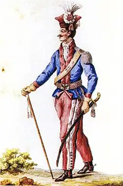 The National Cavalry (Polish: Kawaleria narodowa) was a branch of Polish–Lithuanian cavalry in the Polish-Lithuanian armed forces in the last quarter of the 18th century. Formed as a merger of previously-existing units of Winged hussars, pancerni and petyhorcy that were still in service after the Confederation of Bar. In 1777 the Sejm new regulations converted all units of heavy cavalry and medium cavalry and reformed them into a line cavalry, roughly similar to later uhlans popular in Europe in the 19th century. Existing dragoon and Front or Vanguard Regiments were outside this reform. The National Cavalry had a very short history of 20 years, and some units stationed in the eastern Polish–Lithuanian Commonwealth were forcibly incorporated into the Russian cavalry following the Second Partition of Poland, and the remainder was disbanded together with the rest of Polish–Lithuanian armed forces after the final partition in 1795. The Sejm's 1777 decision was a rather late effort to modernize Polish–Lithuanian cavalry, along with the much earlier trend of evolution of European cavalry towards the more modern organization of the cavalry regiments into more mobile formations. The most modern part of the reform was the establishment of some very modern battle dress uniforms for these cavalrymen, and in turn, this uniform of the National Cavalry inspired numerous similar uniforms and employment of 'Polish lance' in the rest of Europe, notably the Austrian, Prussian, Russian cavalry, and later of the French cavalry of the Napoleonic Wars.