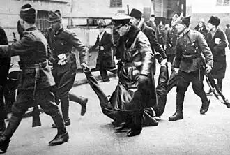 The avalanche of antisemitic legislation culminated on 21 January 1938, when the Goga-Cuza government promulgated a decree aimed at revising the criteria for citizenship, after alleging that previous cabinets had allowed Jews who fled Ukraine during the Great War to obtain it illegally.[61][62] It required all Jews who had received citizenship in 1918-1919 to reapply for it, and set an impossibly high bar for documentary proof of such citizenship, while providing only 20 days in which this could be achieved.[63] It effectively stripped 250,000 Romanian Jews of Romanian citizenship, one third of the Romanian Jewish population.[62][64] Because of its harsh antisemitic policies and violence, the Goga-Cuza government has been referred to as "more Nazi than the Germans".[65]