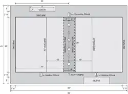 The court is divided into two 30 feet (9.1 m) by 30 ft (9.1 m) areas, with a 4 feet (1.2 m) by 30 ft (9.1 m) neutral zone located at center court separating the two sides, an attack line located parallel and 10 feet (3.0 m) from the center line, for a total court length of 60 feet (18 m) from endline to endline, and a total width of 30 feet (9.1 m) from sideline to sideline.
