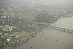 Aerial view of ONGC bridge across Tapi river, Gujarat