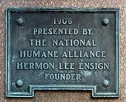The National Humane Alliance was founded in 1897 by Hermon Lee Ensign, a philanthropist and animal welfare advocate who had amassed a fortune in the advertising business. When he died in 1899, he left much of his wealth to build animal drinking fountains for any city that requested one. The fountains were provided free of charge as long as the city provided an appropriate site, water supply, and maintenance.[1] Between 1904 and 1912,[2] more than 100 cities took advantage of the offer. The fountains were produced in Vinalhaven, Maine by the Bodwell Granite Company,[3][4] the same company that supplied the stone blocks for the Brooklyn Bridge.
