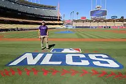 Billy Bean standing with the NLCS logo at Dodger Stadium in 2016