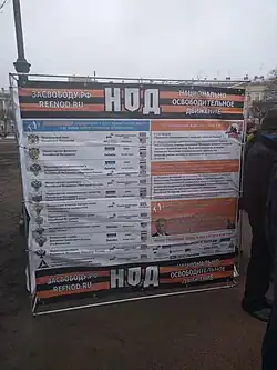 The National Liberation Movement (NLM or NOD; Russian: Национально-освободительное движение; НОД; Natsionalno-osvoboditelnoye dvizheniye, NOD) is a Russian far-right political movement.[3] The first mentions of the movement refer to November 2012.[4][5][6] It is positioned by its activists as an organization without legal personality.[7]
