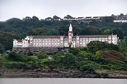 The School was built by Edward Gabriel in 1905,[10][13] at a cost of £30,000.[14] It had three storeys with four storeys in the central tower with a basement. The building was fronted with Ionic pilasters.[15] The dormitories had wooden floors and hammocks to simulate the environment on a ship, although the hammocks were later replaced with beds. A gymnasium was also provided. The land in front of the building was used as a parade ground and then had playing fields close to a jetty and the foreshore.[10] The mizzen-mast from the old ship was placed in the school grounds. Other timber was used to make the pulpit of the school's chapel, which was built on land donated by William Wills, 1st Baron Winterstoke.[2]
