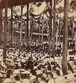 The National Peace Jubilee was a celebration that commemorated the end of the American Civil War, organized by Patrick Gilmore in Boston from June 15–19, 1869. It featured an orchestra and a chorus, as well as numerous soloists. More than 11,000 performers participated, including the famous violinist Ole Bull as the orchestra's concertmaster,[1] and Carl Zerrahn as director of the choral forces.[2] The Jubilee became the "high-water mark in the influence of the band in American life".[3] Along with the World's Peace Jubilee and International Musical Festival in 1872, it made Gilmore a famous composer and bandmaster. For the Jubilee, a newly commissioned "Hymn of Peace" was written by Dr. Oliver Wendell Holmes, set to the music from "American Hymn" by Matthias Keller (1813-1875) and performed on the opening day.[4]
