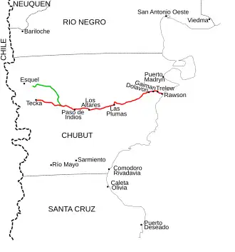 On September 7, 2004, the National Highway Authority (Dirección Nacional de Vialidad) and Provincial Highway Authority (Administración de Vialidad Provincial) signed an agreement exchanging Provincial Route 62 between Tecka and Pampa de Agnia (paved between 1974 and 1976[1]) for National Route 25 (unpaved) between Pampa de Agnia and National Route 40 (marked in green on the map). This agreement was ratified by Provincial Law 5486 promulgated on May 31, 2006.[2]