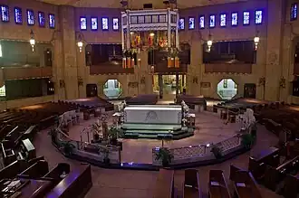 Behind the tower are doors leading to a large chapel that connect the tower with the main sanctuary. The altar of the chapel is within the base of the tower. The octagonal nave seats 3,000 on two levels, with the altar in the center. The main building is granite and limestone, with exterior and elaborate interior sculptural work by Corrado Parducci, including a lectern and Stations of the Cross, and hand-painted murals by Beatrice Wilczynski. Set into the exterior walls are stones carved with the names and official flowers of each of the states. The octagon-shaped granite baptismal font was designed by liturgical artists Robert Rambusch and Mario Agustin Locsin y Montenegro.