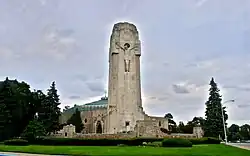 A dramatic limestone Art Deco tower called the Charity Crucifixion Tower, completed in 1931, features integrated figural sculptures by Rene Paul Chambellan, including a large figure of Christ on the cross, 28 ft (8.5 m) high on the Woodward Avenue façade. The sculpture, using Chambellan's design, was completed by Italian stone carver, Enrico (Harry) Liva, chief carver of the Ingalls Stone Company of Bedford, Indiana.[11][12] It was built as a response to the Ku Klux Klan as a "cross they could not burn".[13] The sides and rear feature windows inside the crucifix which can be lit from within. At the upper corners of the tower are symbols of the Four Evangelists. Carved below the feet of the figure of Christ are the Seven Last Words from the Cross. Just below them is a doorway with "Charity" and "Christ Crucified" carved above it. On the sides of the doorframe are depictions of items associated with the Passion. The doorway leads to a small balcony which can serve as a pulpit. On the front are carved depictions the Archangels Jophiel, Raphael, Michael, Gabriel and Uriel. The pulpit is flanked by depictions of John the Apostle and the Virgin Mary to the left and a Roman Centurion holding a spear and Mary Magdalene on the right.[14] Across the terrace facing the crucifix a depiction of Saint Thérèse of Lisieux is carved into the surrounding wall. This sculpture is also by Chambellan.