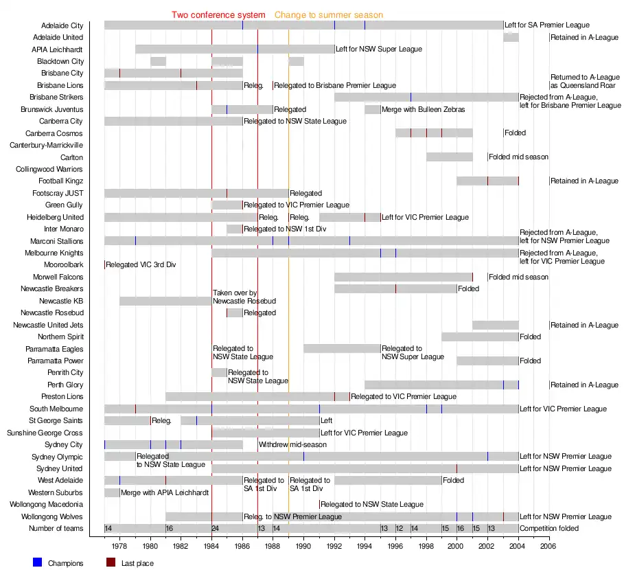 During the history of the NSL the league was contested by a total of 42 teams; 41 based in Australia and one based in New Zealand. Seasons initially ran during the winter seasons, until 1989 when this was changed to the summer season. In 1984, the league was split into two conferences (Northern and Southern) to introduce more teams into the competition; the league returned to a single division in 1987. The competition was known by various names through sponsorships; these names included the Philips Soccer League, the Quit National Soccer League, Olympic Airways Soccer League, Coca-Cola Soccer League, the Ericsson Cup and the A-League.[2][3][4][5][6][7]