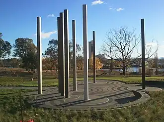 The memorial consists of eight tall stone poles, symbolically sighted across a stylised map of Australia in the places of the state and territory capital cities. Architectural firm Johnson Pilton Walker[5] has placed concentric circles around the poles with words representing the intended outcome of knowledge and application of good practices of work health and safety.