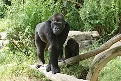 The Great Ape House opened in 1981 and is separated into two sets of enclosures. One houses six western lowland gorillas (two males named Baraka Ya Mwelu and Moke; three females named Calaya, Mandara and Kibibi; and a female infant named Zahra, born in 2023). The other houses six orangutans (two males named Kiko and Redd; and four females named Batang, Lucy, Iris and Bonnie). The orangutans are allowed access to the Think Tank (see below) by traveling along the "O-Line", a series of high cables supported by metal towers that enable the orangutans to move between the two buildings. Batang and Redd are Bornean orangutans while Kiko, Lucy, Iris and Bonnie are all hybrid orangutans.