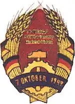 Another proposal created by Fritz Behrendt at the request of FDJ chairman Erich Honecker was done in the socialist style similar to that of the Soviet Union, depicting two wreaths of wheat wrapped with ribbons with the German national colours, with a ribbon in the center with the text "7. OKTOBER 1949", with the name of the state above a hammer within a gear. However, the design was not adopted as Behrendt was accused of being a Titoist and arrested in December 1949.[4][5] Nevertheless, many of the elements in Behrendt's proposal such as the German tricolour ribbons and the hammer were eventually used in the emblem and its subsequent versions.[5]
