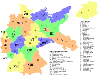 During the Weimar Republic, a three-tiered variant of the national remnant system was used for elections to the Reichstag. The country was divided into 16 electoral associations (sg. Wahlkreisverband), in turn divided into 35 electoral districts (sg. Wahlkreis). Parties got one seat for every 60,000 votes they won in a district, and votes that were not converted into seats were fed into the associations. Here, the process would be repeated, with parties being given another seat for every 60,000 residual votes, followed by another round at the federal level where every 60,000 votes would once again translate into a seat.