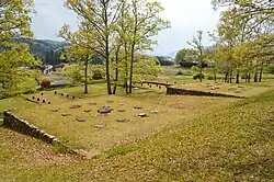 ![]() The remains of the Pagoda on the left, Kondō on the far right, the priest's residence on the far left and the remains of the lecture hall at the back | |
