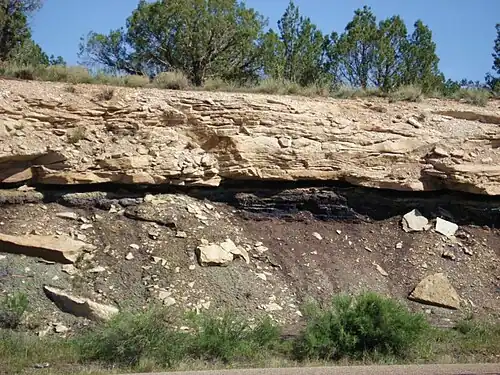 The formation is described as having a lower section that is dark-brown to black, carbonaceous claystone, gray shale, and siltstone, and some beds of gray-orange to white coarse-grained sandstone which may form ledges; a middle section of mostly thin, but locally thick coal beds; and an upper section that is gray-orange to light brown, moderately erosion resistant, locally fossiliferous sandstone that is interbedded with light-olive-gray shale. Locally, a channel conglomerate is present at the base.[4] Where missing, a lag of conglomerate may be present indicating winnowing of sediments, which occurred by advancing Cretaceous seas. In other places, deposition of Naturita sediments did not occur, and these areas may have been quiet lagoons because oyster shells are often present in great abundance.