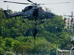 PASKAL Maritime Counter-Terrorism strike team member using the rappeling from Super Lynx helicopter while boarding Tunda Satu naval trawler during 82nd Anniversaries of Royal Malaysian Navy.