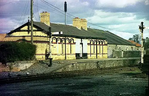 Navan station, along with the branch line, was closed in on 14 April 1958 to passenger services when the Oldcastle line lost its passenger traffic. The station was still open for goods until 7 March 1977, however, the station remains relatively intact, with several freight trains per day still serving the station to and from the Tara Mine.[2][3]