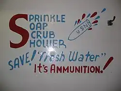 A Navy shower (also known as a "combat shower", "military shower", "sea shower", "staggered shower", or "G.I. bath") is a method of showering that allows for significant conservation of water and energy by turning off the flow of water in the middle portion of the shower while lathering. The total running time of this kind of shower can last less than two minutes – using an initial thirty seconds or so to get wet, followed by shutting off the water, using soap and shampoo and lathering, then rinsing for a minute or less.[1]