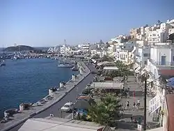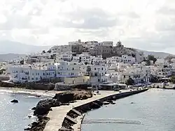 Naxos (Greek: Νάξος), commonly referred to as Chora (Greek: Χώρα, meaning 'town'), is a city and a former municipality on the island of Naxos, in the Cyclades, Greece. The community has 8,897 inhabitants (2021 census).[1] It is located on the west side of Naxos Island in the Cyclades island group in the Aegean. It was an important centre of bronze age Cycladic culture and an important city in the ancient Greek Archaic Period. Since the 2011 local government reform it is part of the municipality of Naxos and Lesser Cyclades, of which it is the seat and a municipal unit.[2]