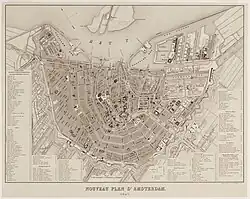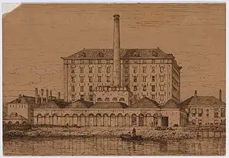 The relatively low production in 1860 may have been due to the company moving refinery activities from the Looiersgracht to the new refinery on Osdorp bastion in mid 1860. This new refinery had 7 boilers.[31] On 30 July 1860 the steam refinery "De Vijf Gebroeders" was brought to auction in separate lots.[32] In late 1861 some merchants then started the Hollandsche Suikerraffinaderij.[33] They used these buildings for their refinery and office.[34]
