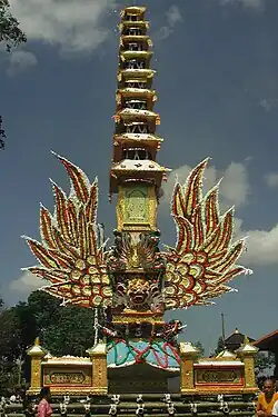 The cremation ceremony was the largest and most ostentatious of the state rituals, attended by all the political dependants of a lord. At the centre of the ritual was the cremation tower (badé) on which the body of the deceased lord rested in state until the whole was consumed in fire. The cremation tower itself symbolized the cosmic order the ritual sought to make real. At its base were the world of demons (winged serpents), above which stood a platform called the House, representing the world of man. Above that were the tiers of roofs symbolizing the world of the gods, to which the deceased was ascending; a commoner would ascend to the first heaven (1 tier), whereas a king to the eleventh.[27]