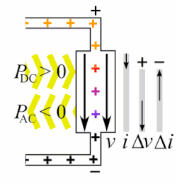 An AC voltage applied to a biased NDR. Since the change in current and voltage have opposite signs (shown by colors), the AC power dissipation ΔvΔi is negative, the device produces AC power rather than consuming it.