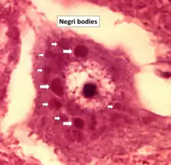 Negri bodies are eosinophilic, sharply outlined, pathognomonic inclusion bodies (2–10 μm in diameter) found in the cytoplasm of certain nerve cells containing the virus of rabies, especially in pyramidal cells[1] within Ammon's horn of the hippocampus. They are also often found in the Purkinje cells[1] of the cerebellar cortex from postmortem brain samples of rabies victims. They consist of ribonuclear proteins produced by the virus.[2]