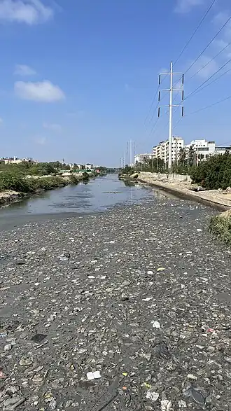 Despite its original purpose of draining rainwater into the sea, and first plans as a 'recreational zone' in the 1970s,[3] Nehr-e-Khayyam has, over the decades, become a focal point of urban interest for environmental reasons.[4] The channel is plagued by heavy pollution, filled with garbage and sewage, a stark contrast to its location in the densely populated and upscale neighbourhood of Clifton.[5][6] Numerous efforts have been made to address the pollution and enhance the aesthetic appeal of the area.[7][8] However, these endeavors have been marred by challenges such as broken contracts, unclear responsibilities, and financial discrepancies, resulting in unresolved legal disputes awaiting adjudication in courts.[9][10] Beyond issues of pollution and degraded water quality, scientific studies have highlighted the pervasive presence of bacteria within the channel, all of which eventually flow through the Chinna Creek into the Arabian Sea.[11]