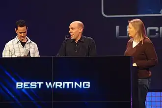 Druckmann (left) accepting the 2010 Game Developers Choice Award for Best Writing with Josh Scherr (center) and Amy Hennig (right)