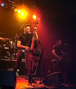 The Nekromantix is a Danish psychobilly band founded in Copenhagen in 1989. Their lyrics are generally structured around monster and horror themes. A central icon of the band's image is founder and frontman Kim Nekroman's "coffinbass", a custom-built double bass with a body in the shape of a coffin and a headstock the shape of a cross. Nekroman has been the sole constant member of the band. The current lineup consists of guitarist Francisco Mesa and drummer Mike Mata.