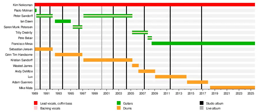 The Nekromantix were formed in 1989 in Copenhagen by Kim Nekroman after he left the Danish Navy, in which he had been a submarine radio operator for eight years.[1] Deciding to launch a new career in music, he initially played drums in a rockabilly band prior to the foundation of Nekromantix.