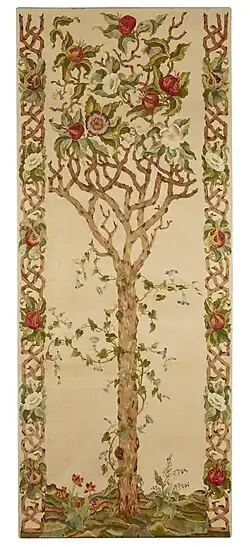 In 1900 the Royal School exhibited work at the Exposition Universelle where Sir Edwin Lutyens had designed a mock Tudor British Royal Pavilion. Whichelo's designs for the furnishings included hangings that were over 12 by 13 feet. The textiles had taken 56 ladies, 8 weeks to embroider[1] and they won a gold medal.[4]